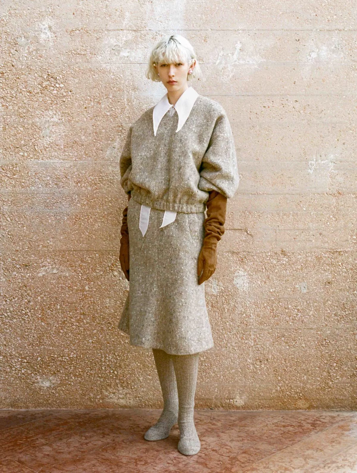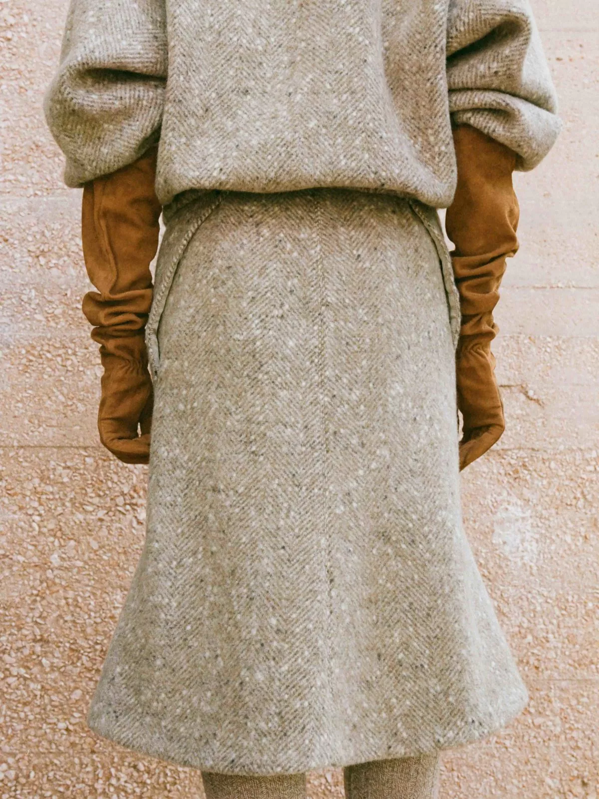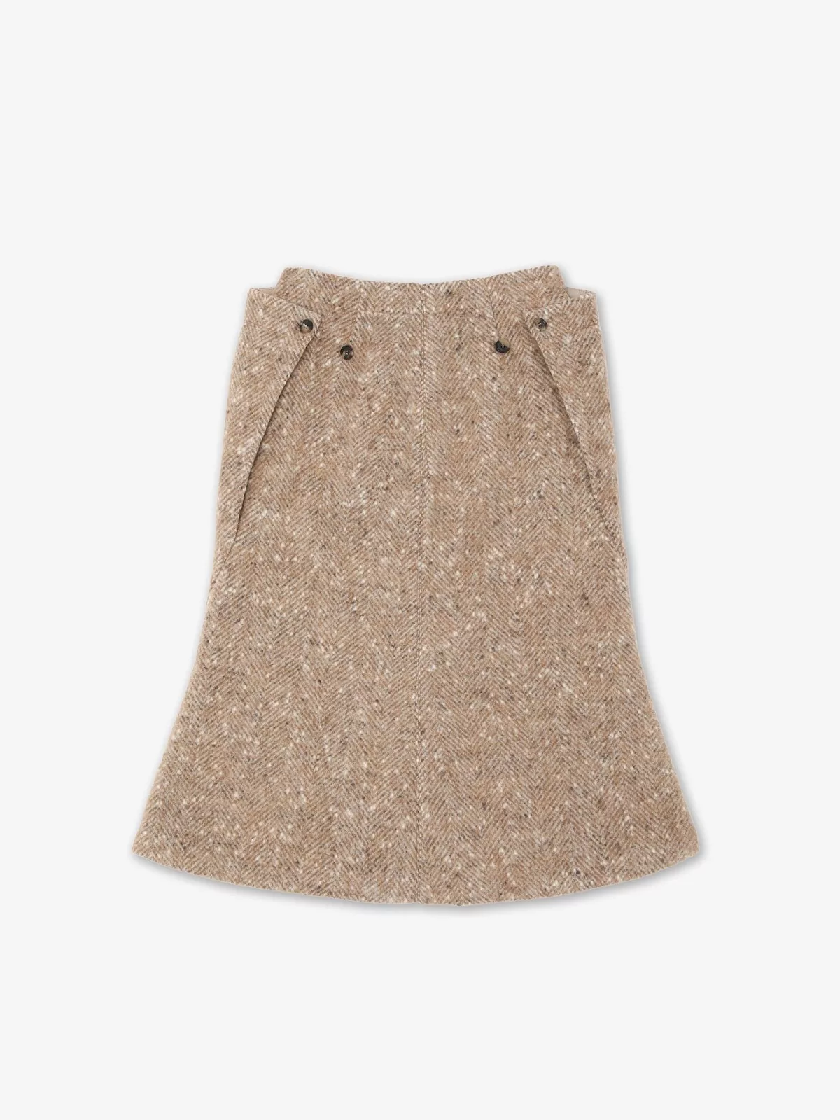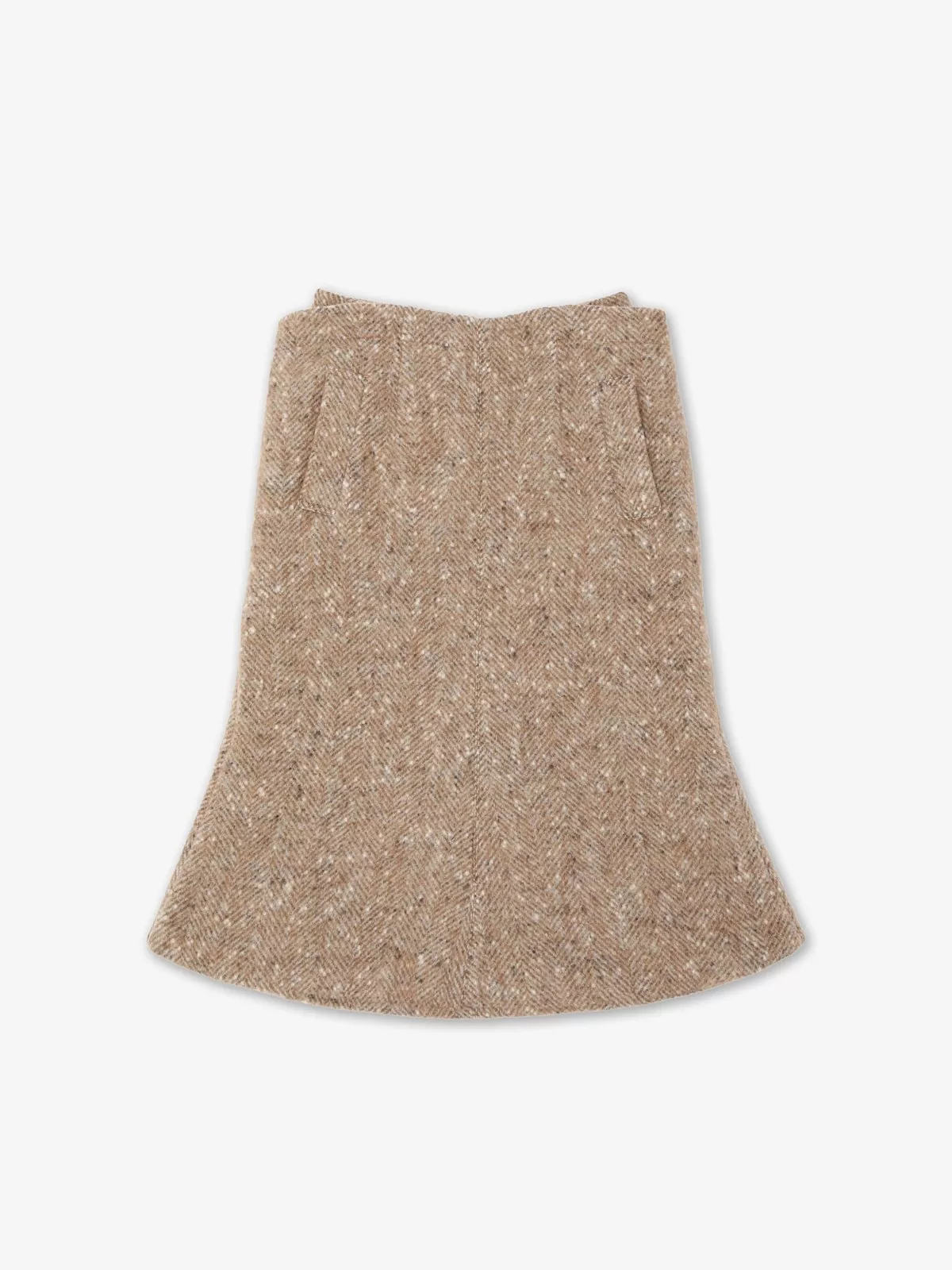 中长款喇叭半裙采用人字纹羊毛混纺面料,两侧设嵌线口袋;背部独特双重叠镶片设计(配纽扣固定),可调节闭合度,打造建筑感廓形。