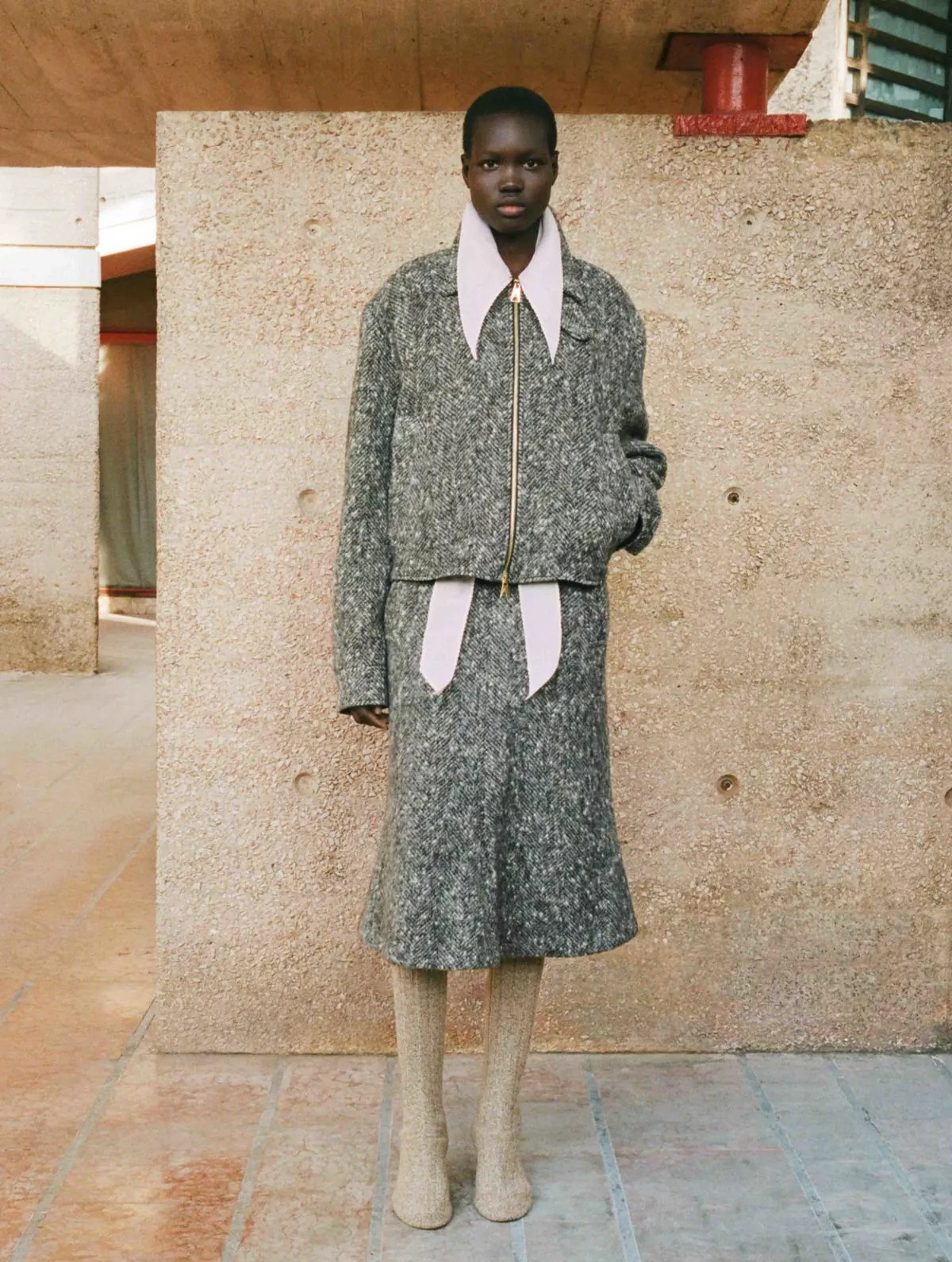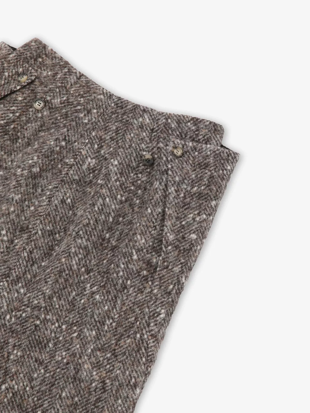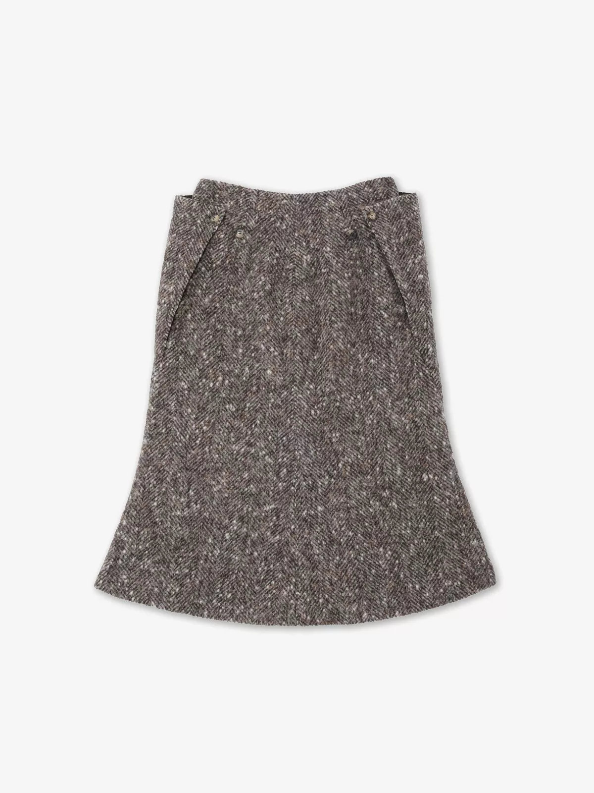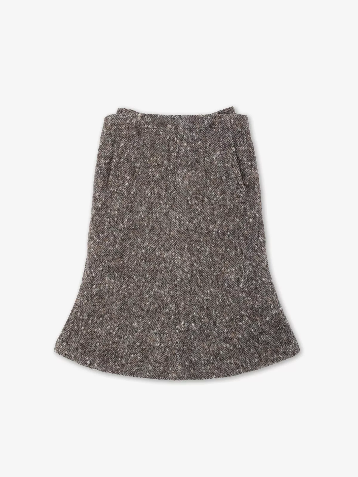 中长款喇叭半裙采用人字纹羊毛混纺面料,两侧设嵌线口袋;背部独特双重叠镶片设计(配纽扣固定),可调节闭合度,打造建筑感廓形。