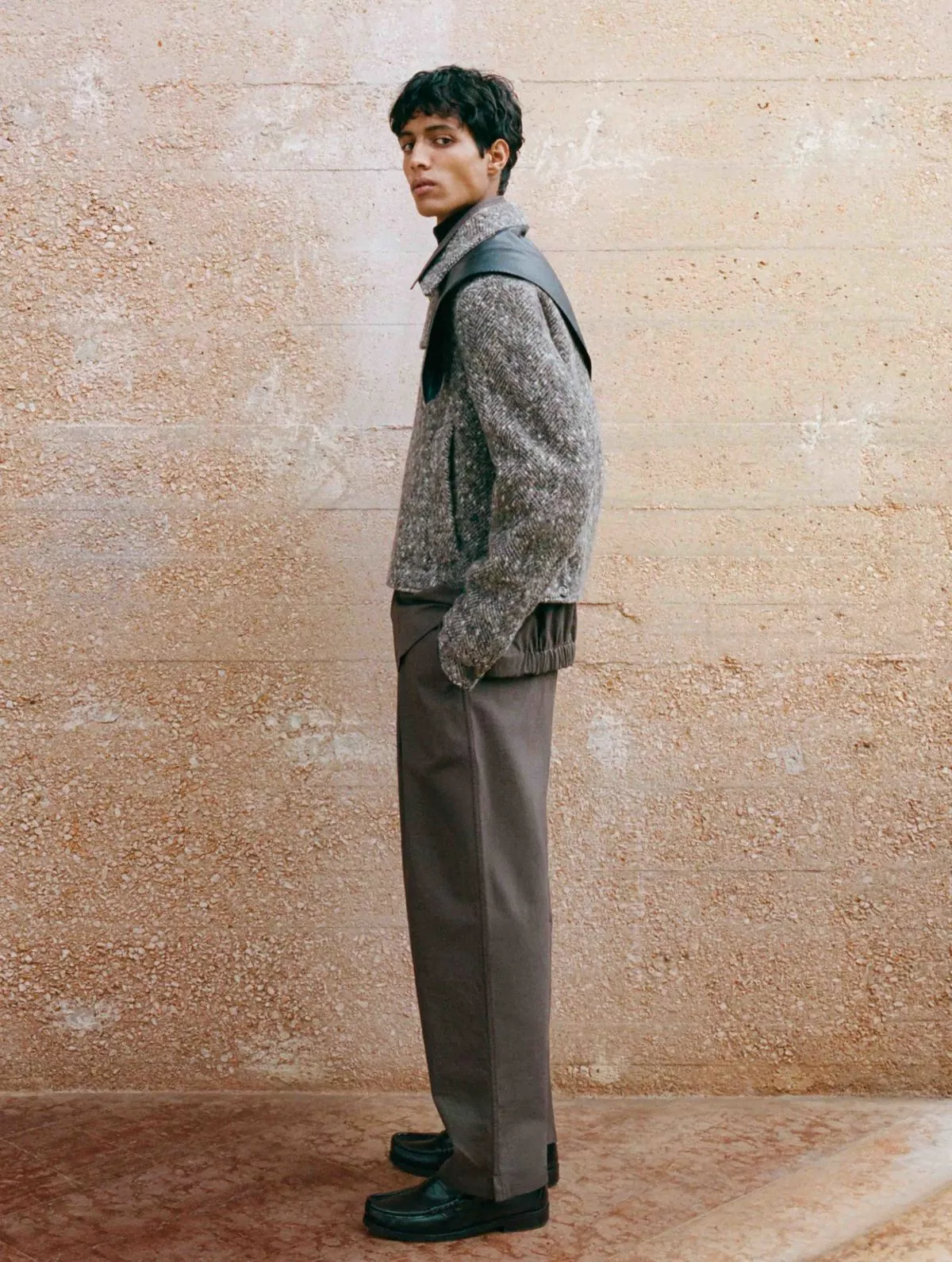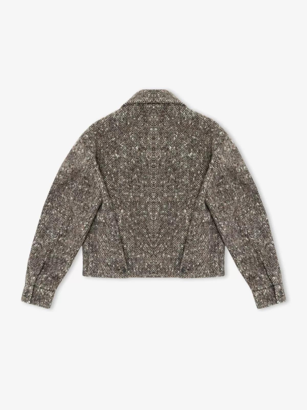 Cropped unisex blouson crafted from a herringbone wool-blend fabric. Designed with a classic shirt collar and a front metal zip closure featuring a double puller. Two jetted pockets accent the sides, while the back is defined by two generous pleats fastened with horn buttons at the hem. Fully lined for comfort and structure.