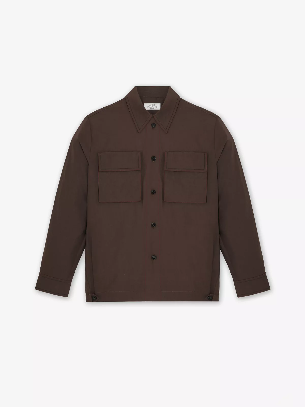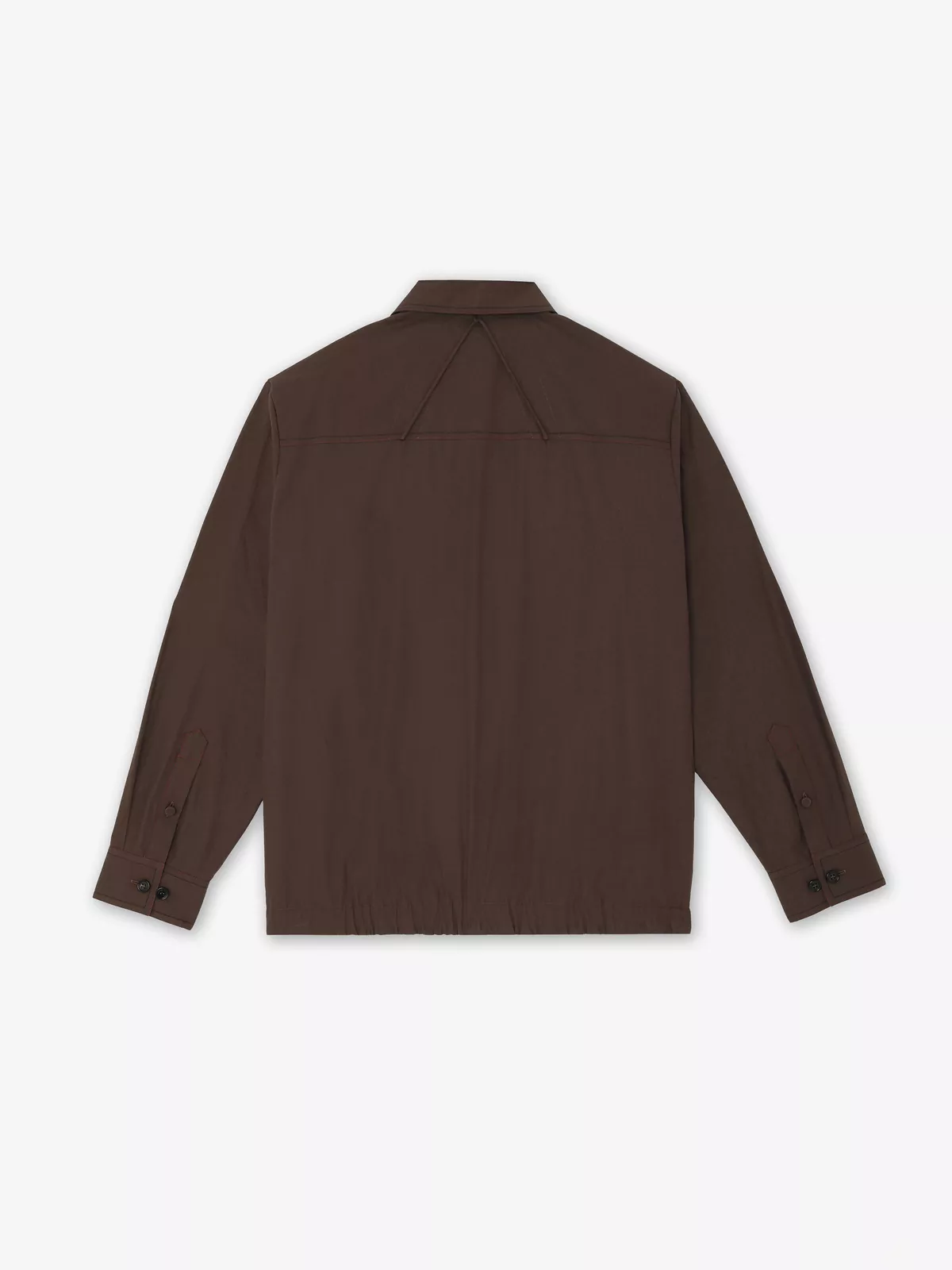 Shirt crafted from crisp cotton poplin fabric, featuring a front closure with horn buttons. The cuffs are detailed with four matching horn buttons each, adding a tailored touch. Two spacious cargo-style pockets accent the chest, while adjustable side tabs—secured with horn buttons—enhance the fit. A signature 'A'-shaped string detail adorns the back, offering a distinctive design element. Subtle contrast stitching throughout lends a refined yet dynamic finish.