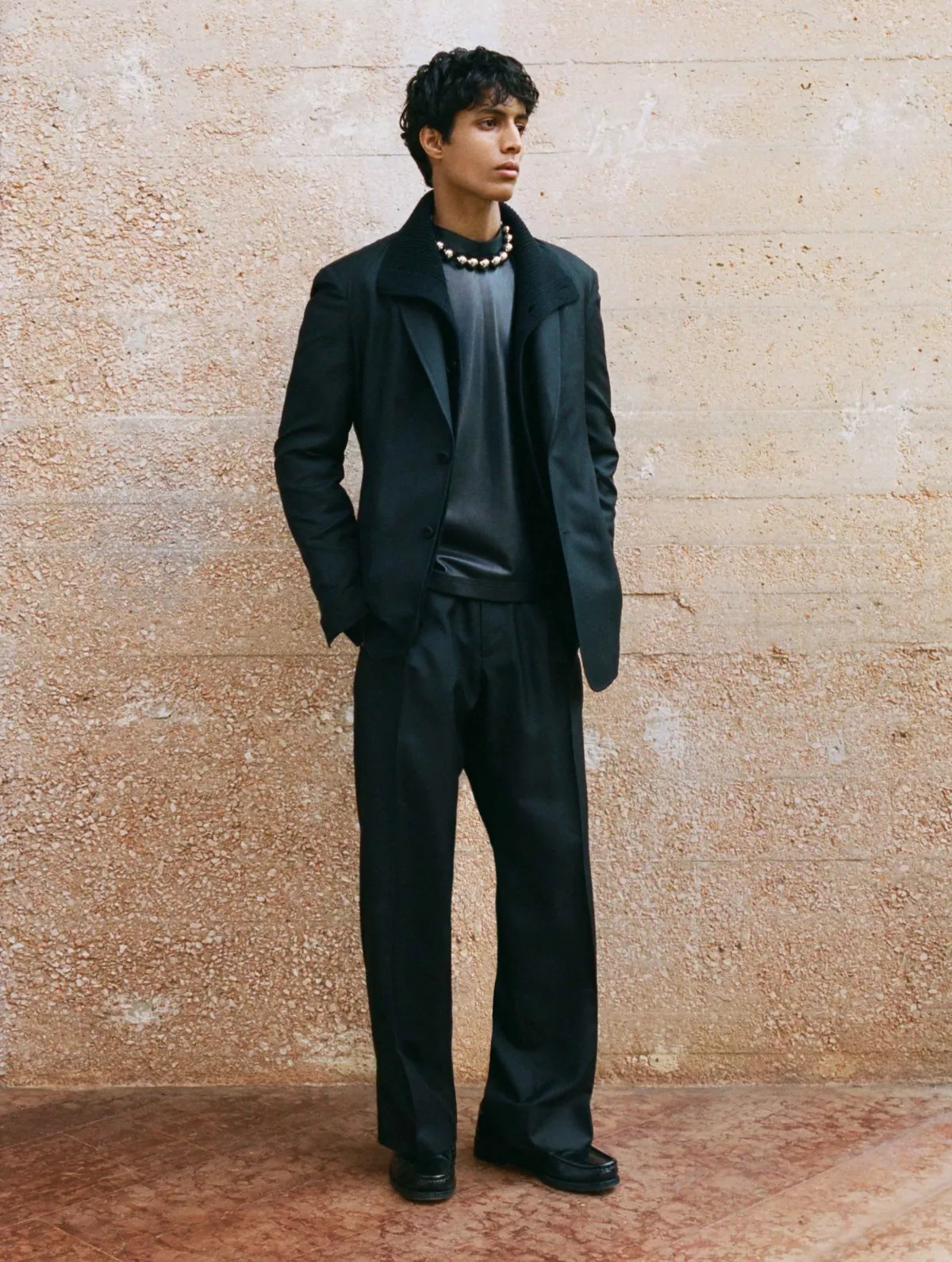 Straight-leg unisex trousers crafted from lightweight silk grisaille fabric. Designed with two side pockets and two back flap pockets for a balanced, tailored silhouette. The front is fastened with a concealed horn button, adding a touch of understated elegance. Inside, a meticulously constructed tailored waistband ensures a refined fit. Belt loops are thoughtfully positioned—two at the back centre, two at the sides, and two at the front—for both function and symmetry.