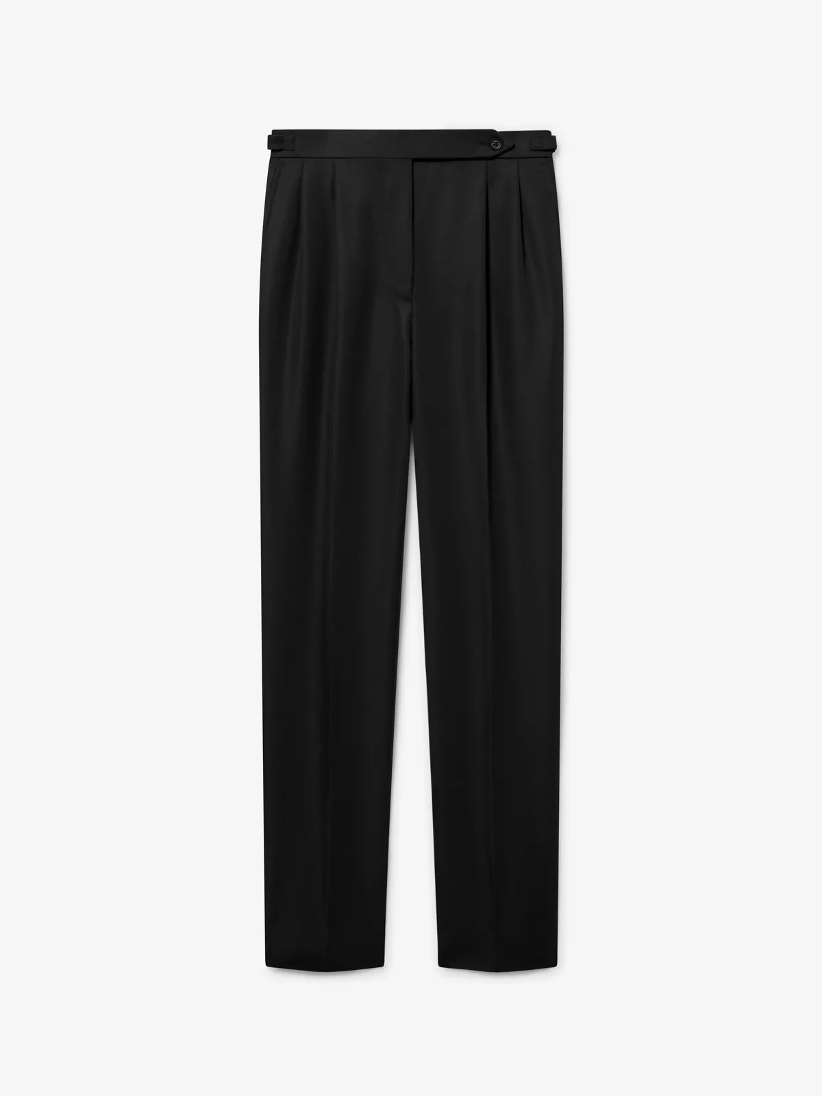 这条裤子是在意大利由柔软光滑的黑色羊毛马海毛混纺面料定做而成的,高腰直腿设计,前侧饰有整齐的烫迹线。
