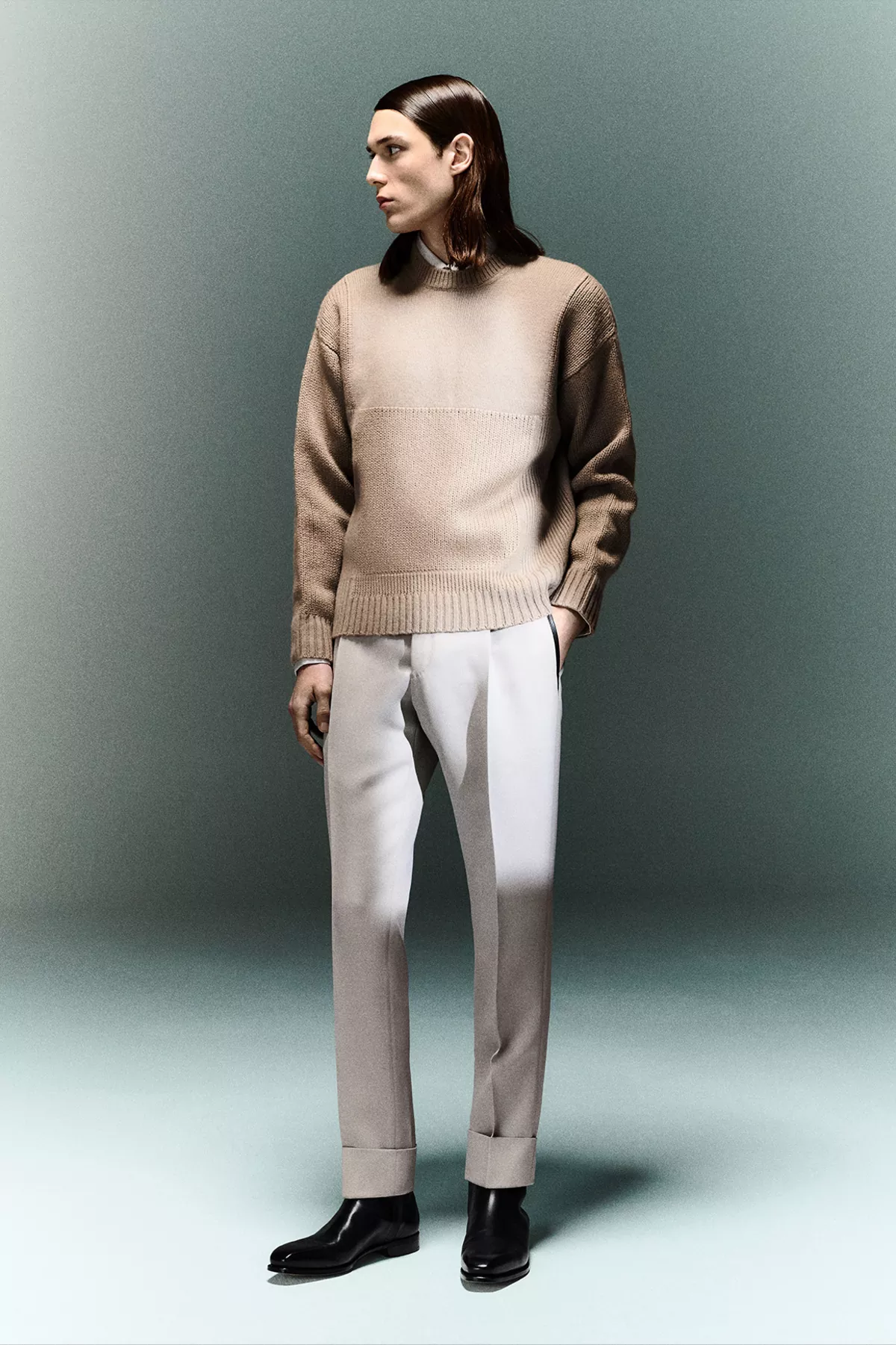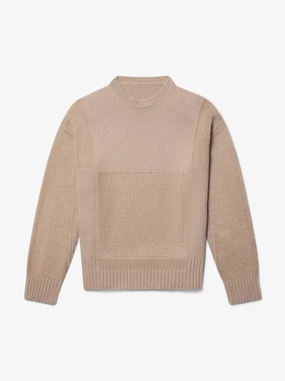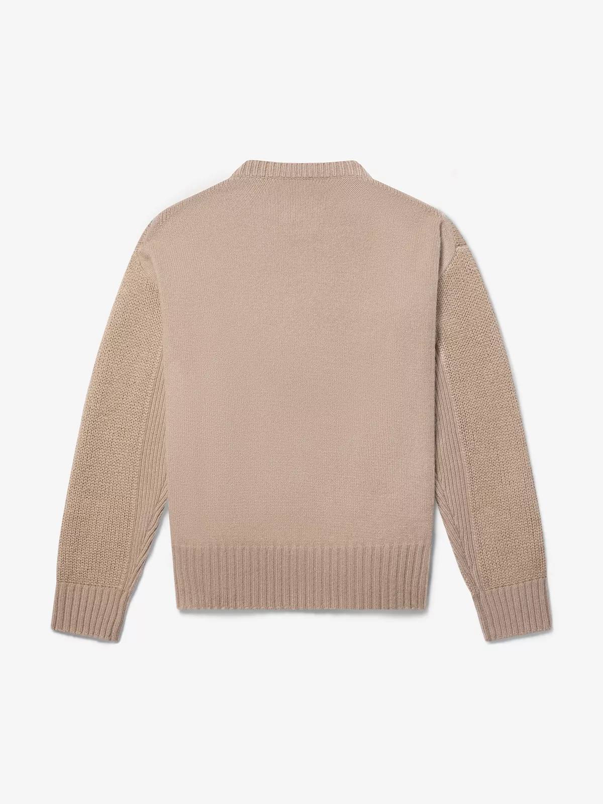 这款毛衣由羊绒、羊毛和桑蚕丝混纺而成,裁剪得非常宽松合身,有图形缝合细节,还配以一个对比色的圆领。