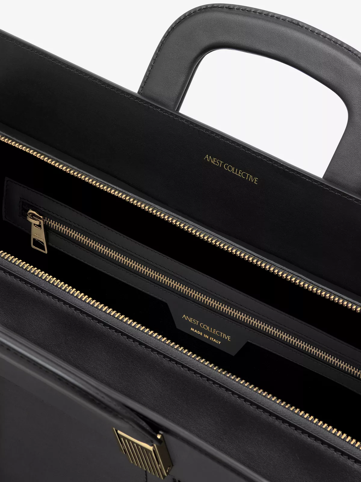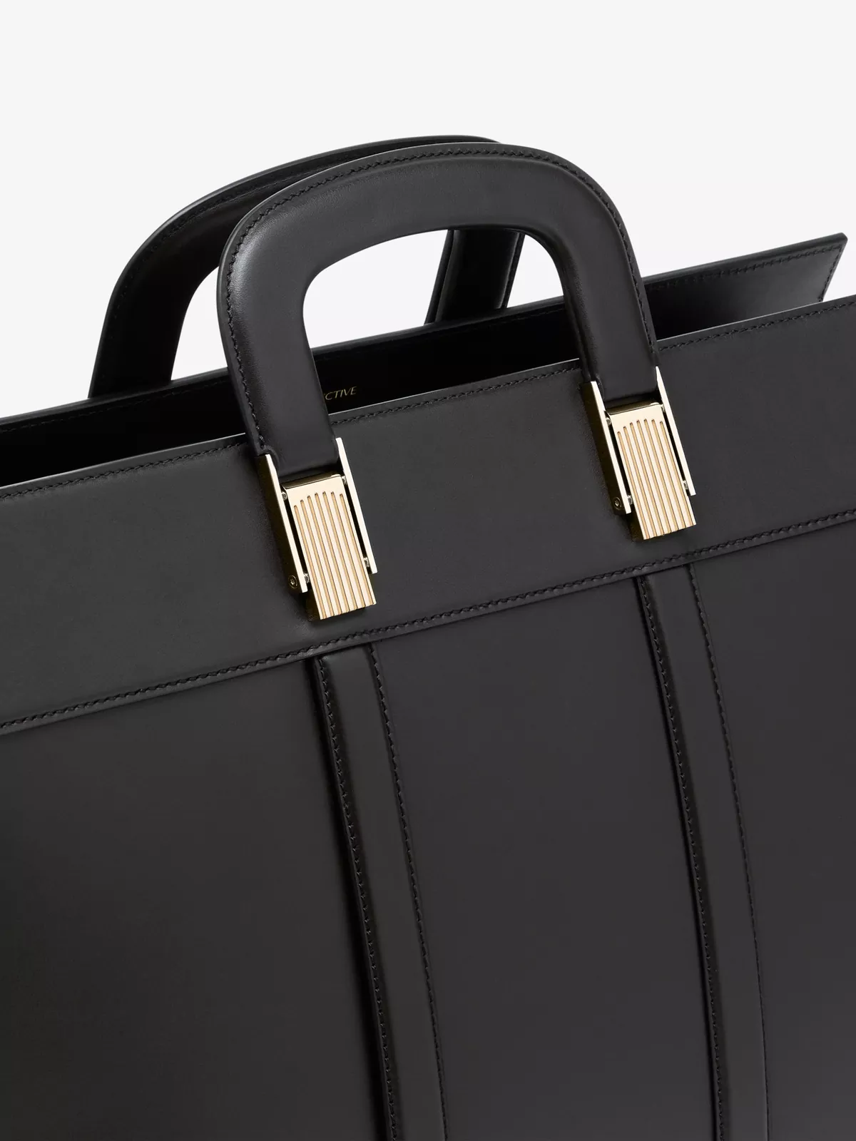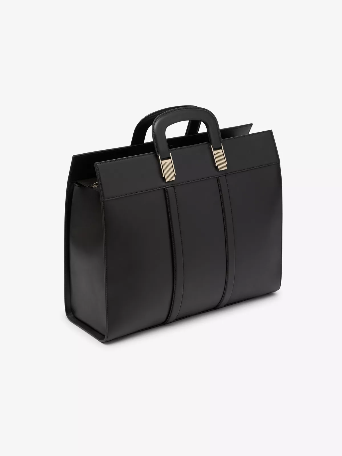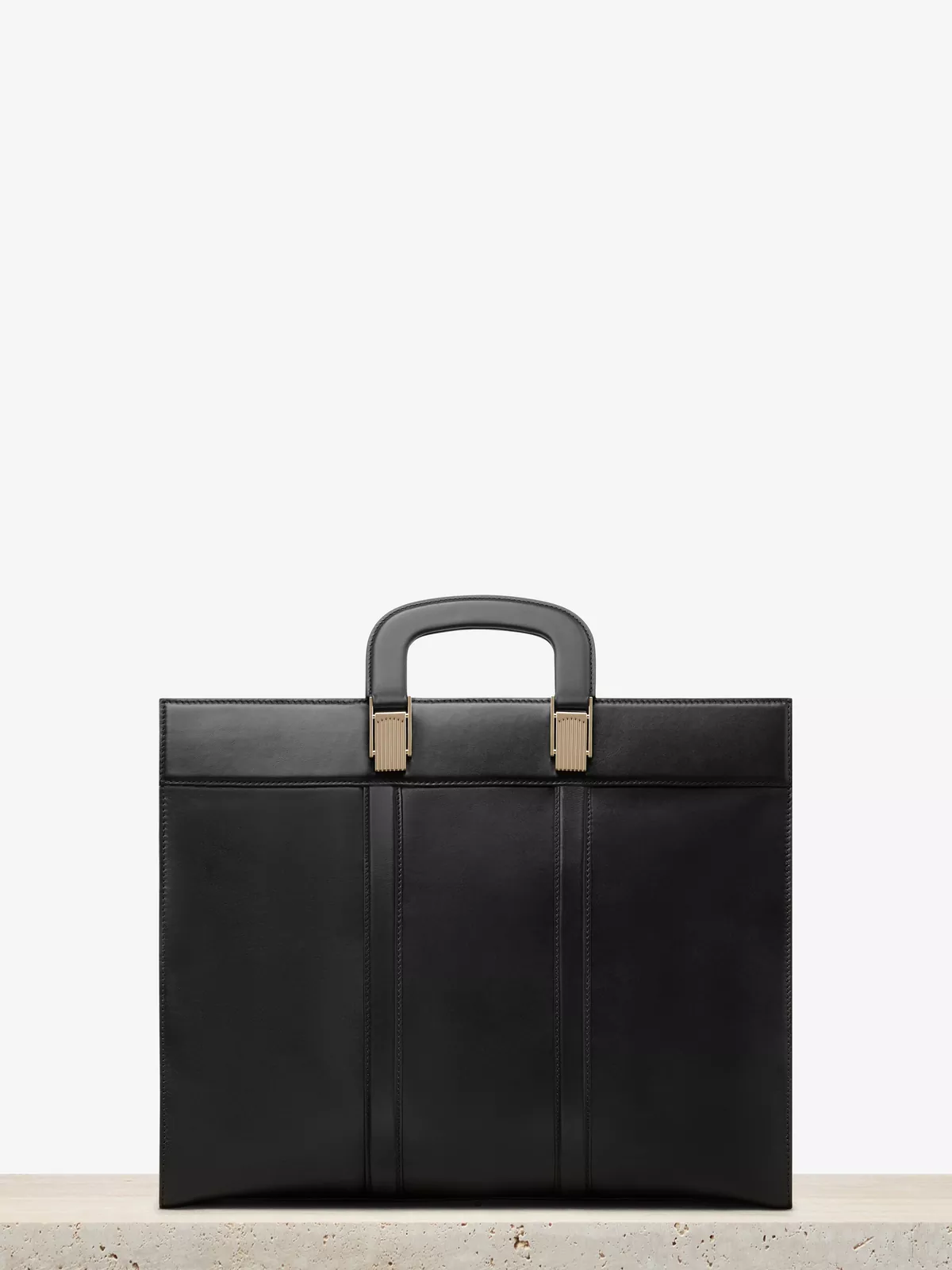 这款大容量托特包采用优质光滑粒面皮革于意大利制成,采用结构化手柄设计,带有隐藏式外部前袋、内部拉链口袋、保护脚和金属细节。宽大的尺寸使其成为周末旅行的理想之选。