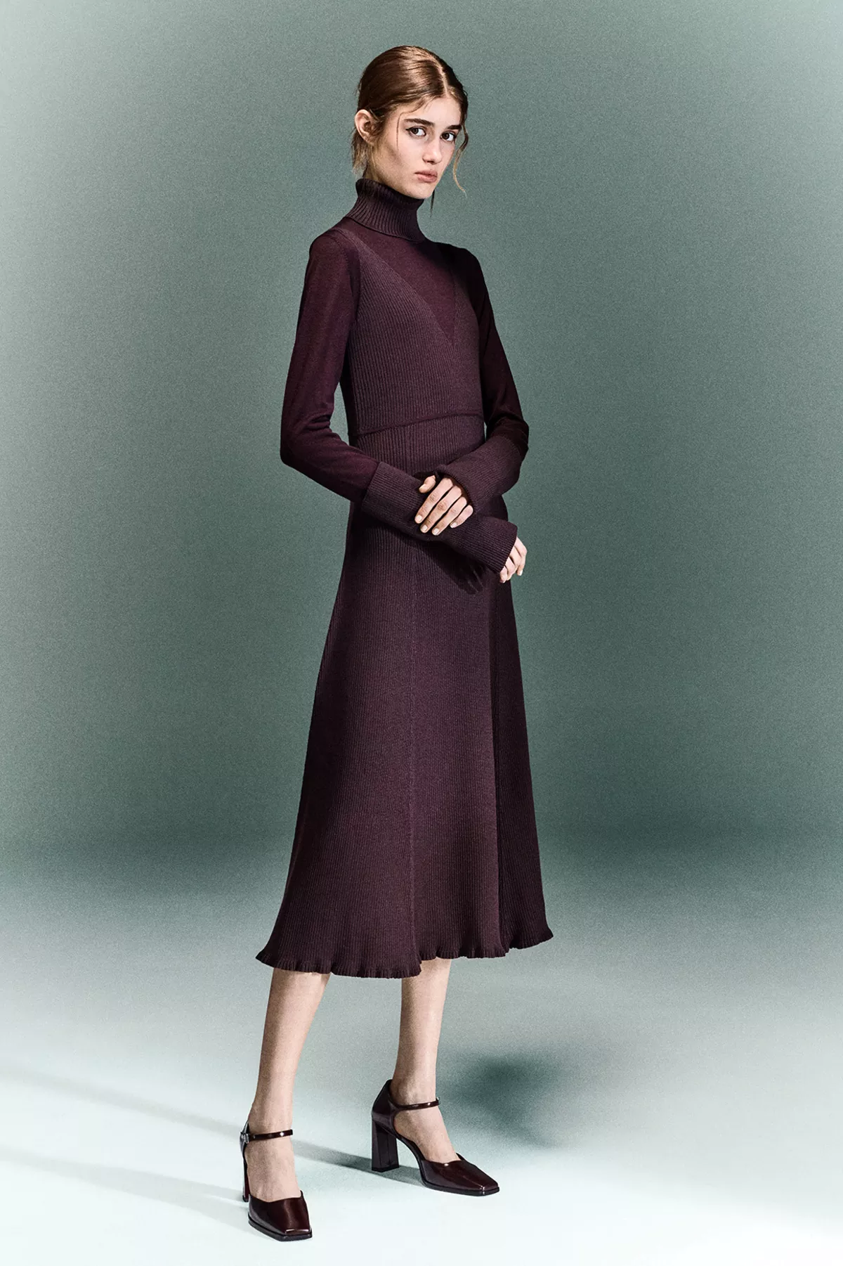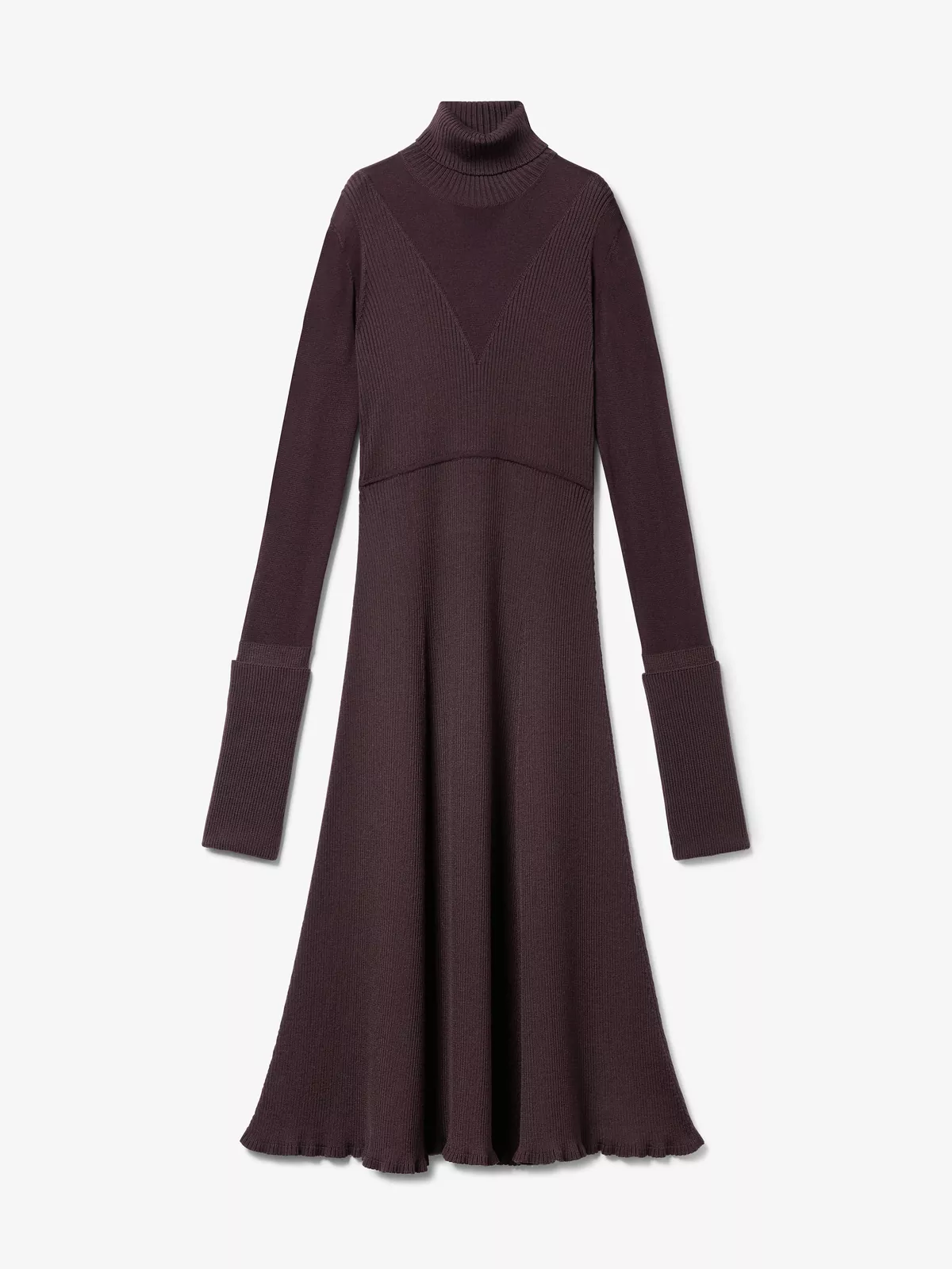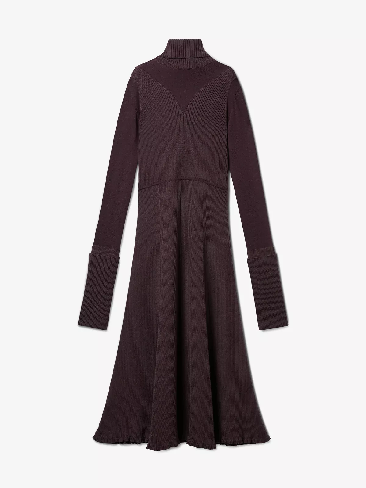 这条由羊绒、羊毛和桑蚕丝混纺面料精制而成的连衣裙有纤细的罗文设计,轻柔的袖子,以及优雅的喇叭裙廓形。