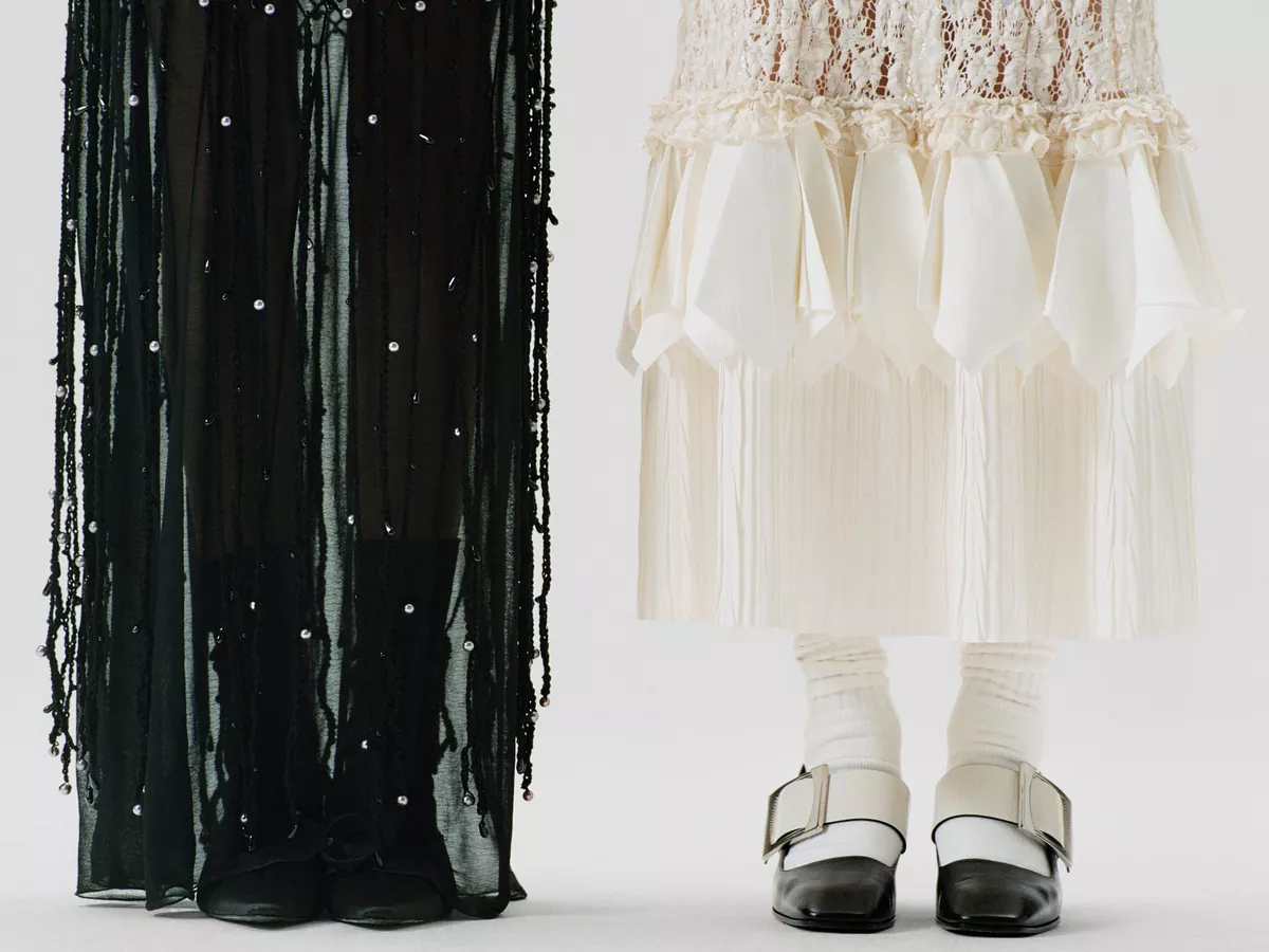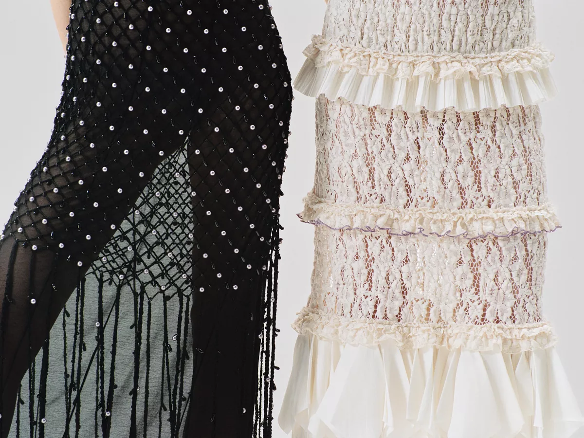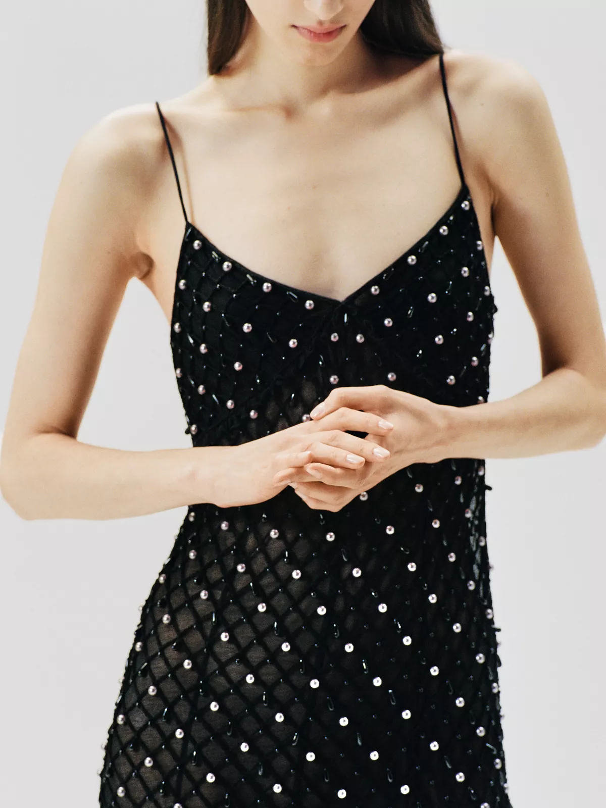 这款引人注目的双层长款吊带裙尽显深邃优雅气质与精湛工艺。裙装上层采用质感独特的黑色流苏钩编织网,缀以深灰色烟熏珍珠和光滑的黑色玻璃珠饰垂坠点缀,在光影间散发着微妙迷人的魅力。内层则是一件黑色薄纱针织吊带裙,轻柔贴合身形,增添了一丝性感朦胧的透视感。两层设计巧妙交织出质感与光影的迷人碰撞。