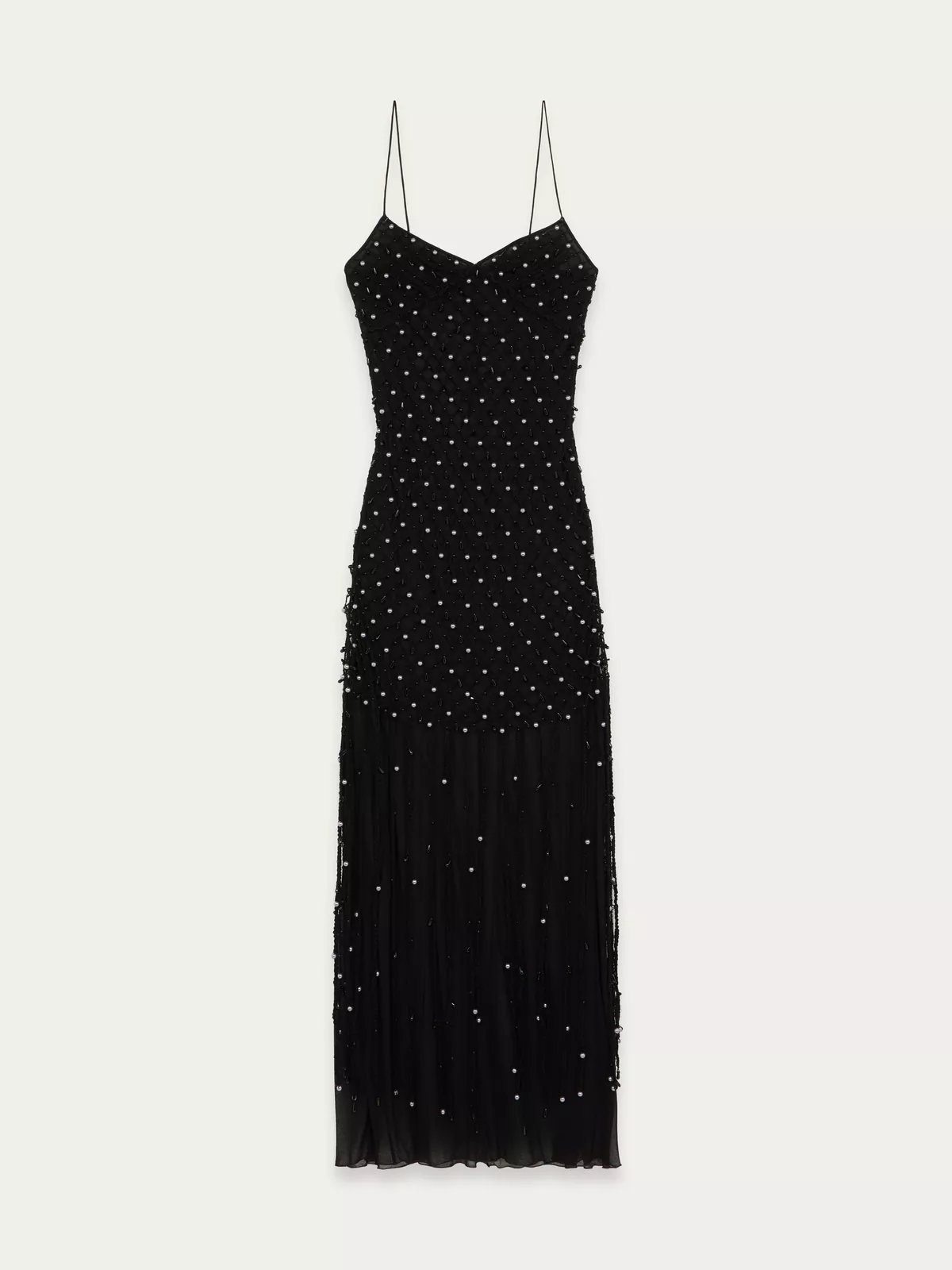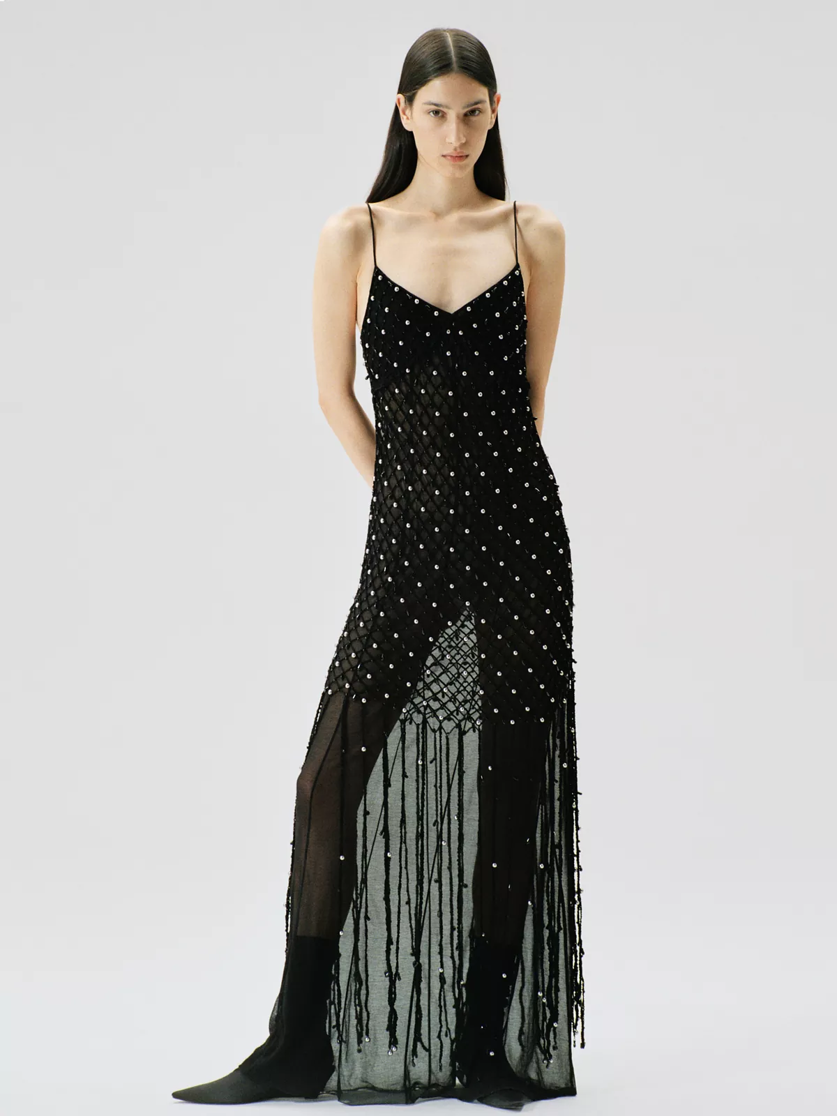 这款双层长款吊带裙大胆而精致,完美契合艺术与优雅交织的晚间盛事与前卫场合。其采用质感独特的黑色流苏钩编织网,点缀深灰色玻璃珠饰与光滑的黑色垂坠装饰,营造出令人着迷的光影交错效果,是盛大活动、专属晚宴或高级时尚聚会的理想之选。