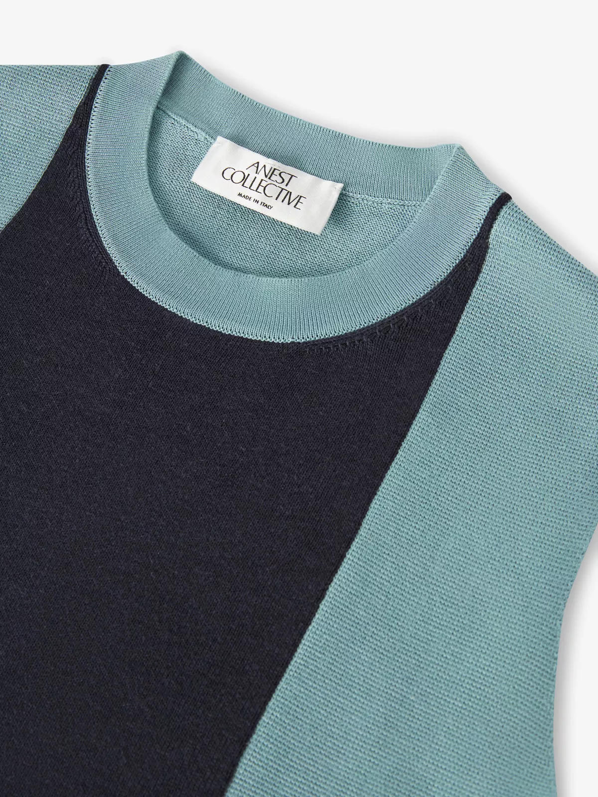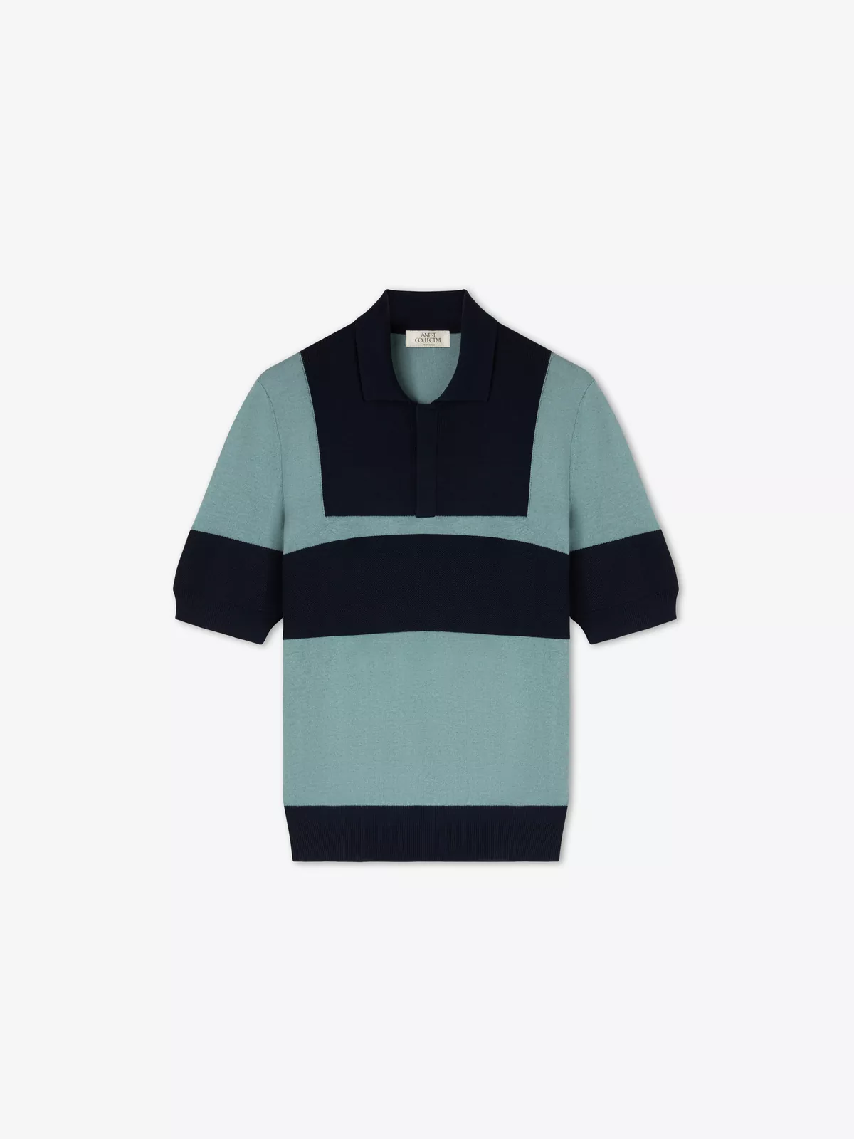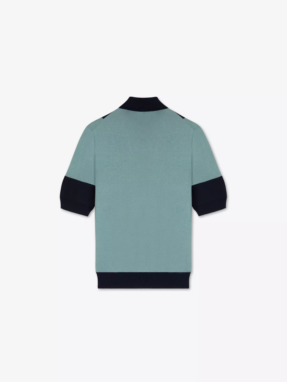 SILK COTTON COLOR BLOCK KNIT POLO IN EUCALIPTUS/MIDNIGHT BLUE