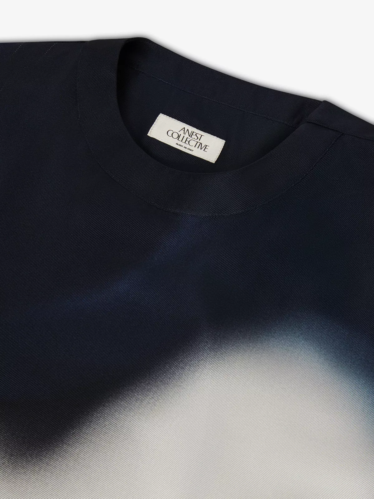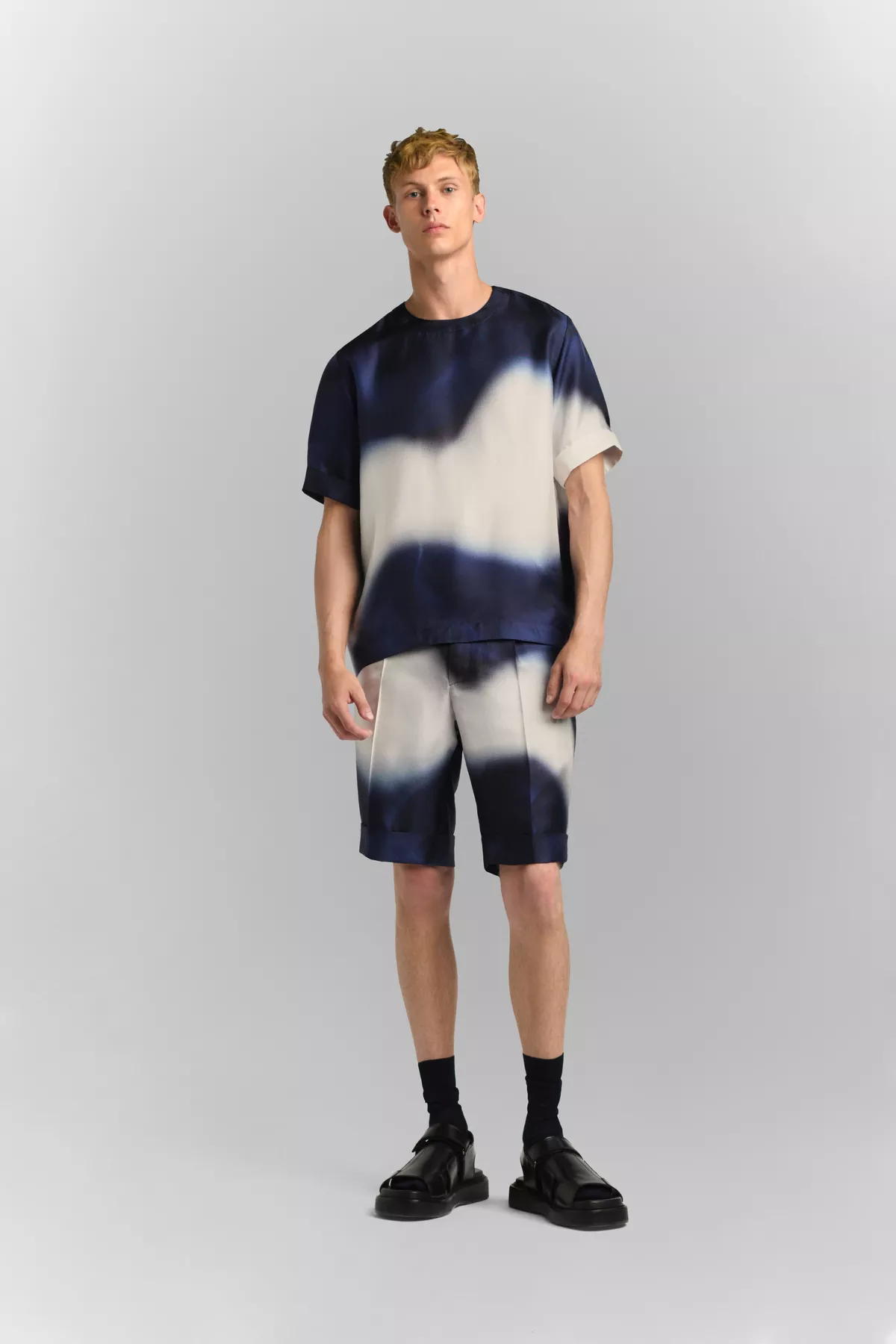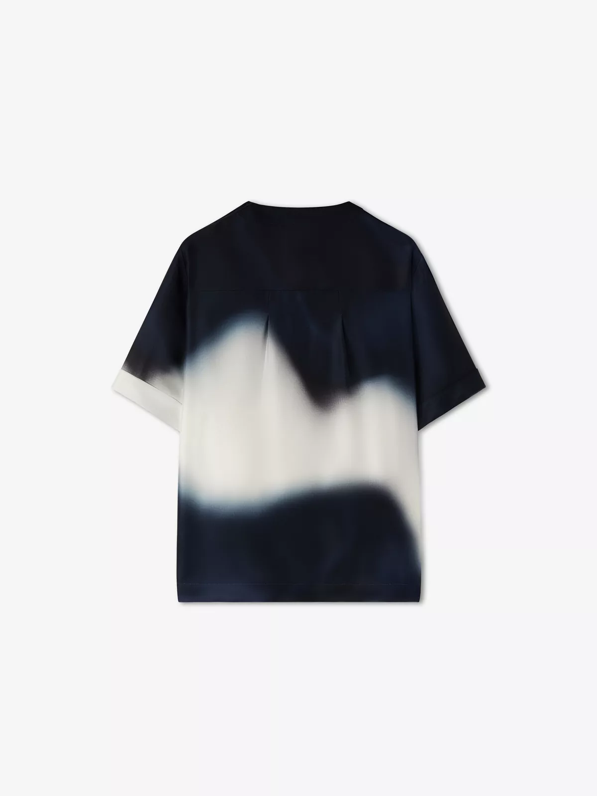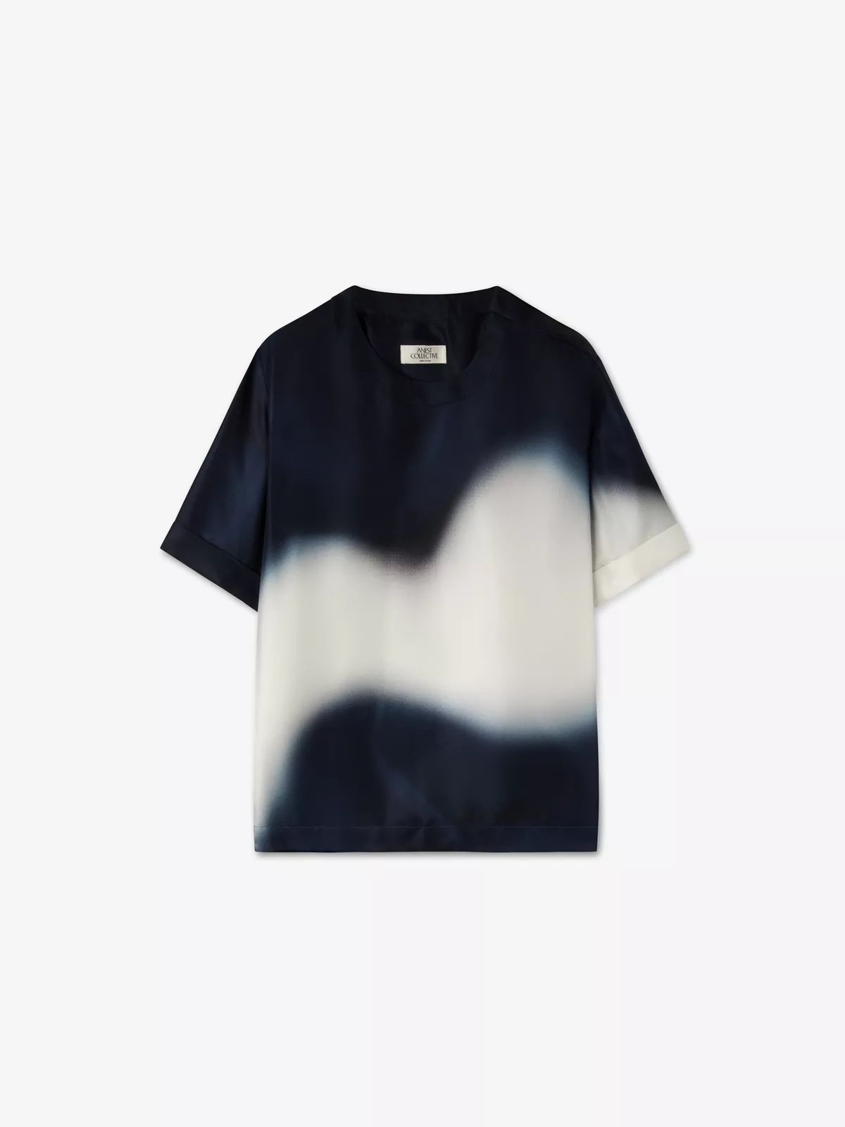 Crew neck short sleeve top in silk twill with placed "Abstract noise" print. It features a top stitching details on the back.