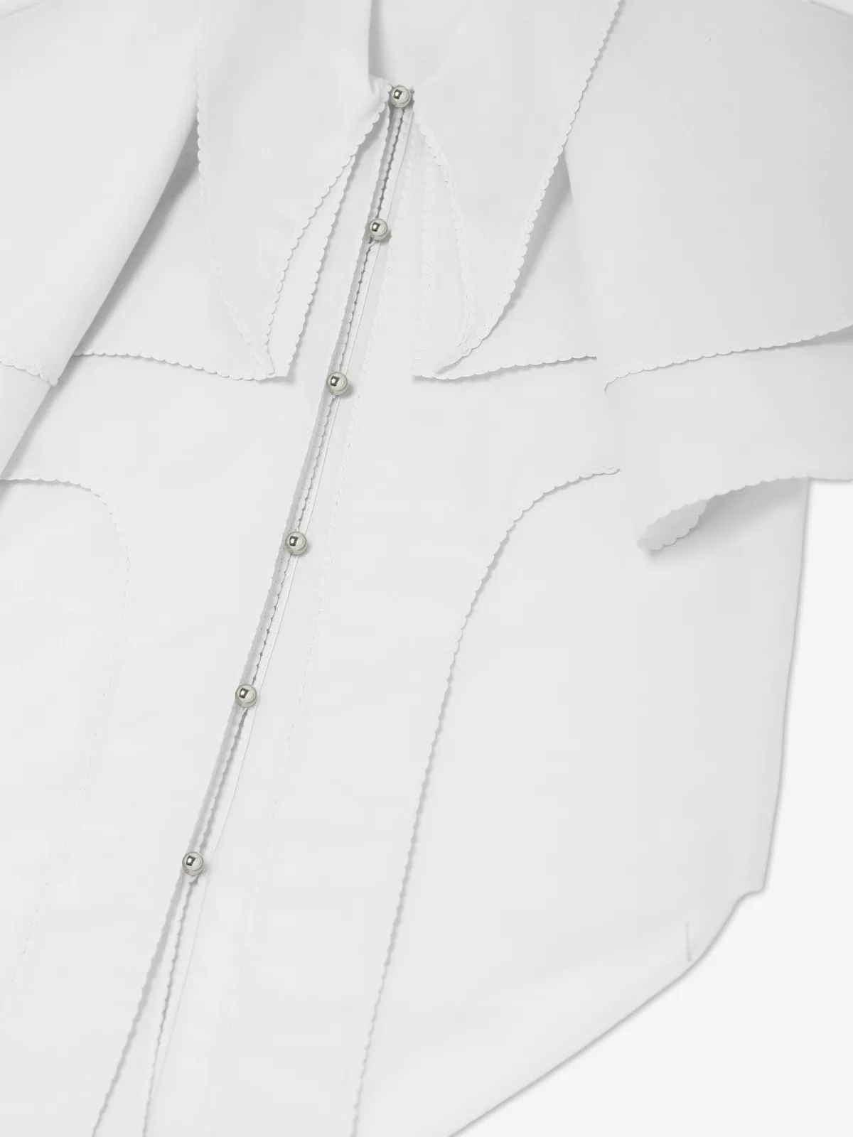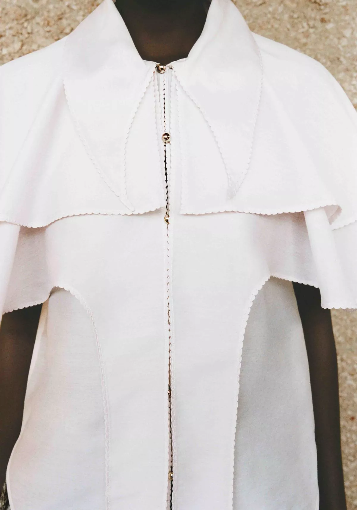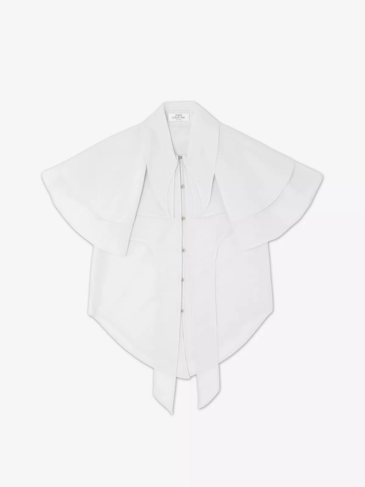 Layered top crafted from a lightweight cotton-silk blend, offering a soft, fluid drape with a subtle sheen. The front is detailed with delicate yarn-made buttonholes, each accented by a small silver boule for an elegant, artisanal touch. Featuring a bold shirt collar and a sculptural shoulder mantle, the silhouette blends classic tailoring with a contemporary twist. The edges are finished with doll stitching, adding a refined, hand-crafted feel to the overall design.