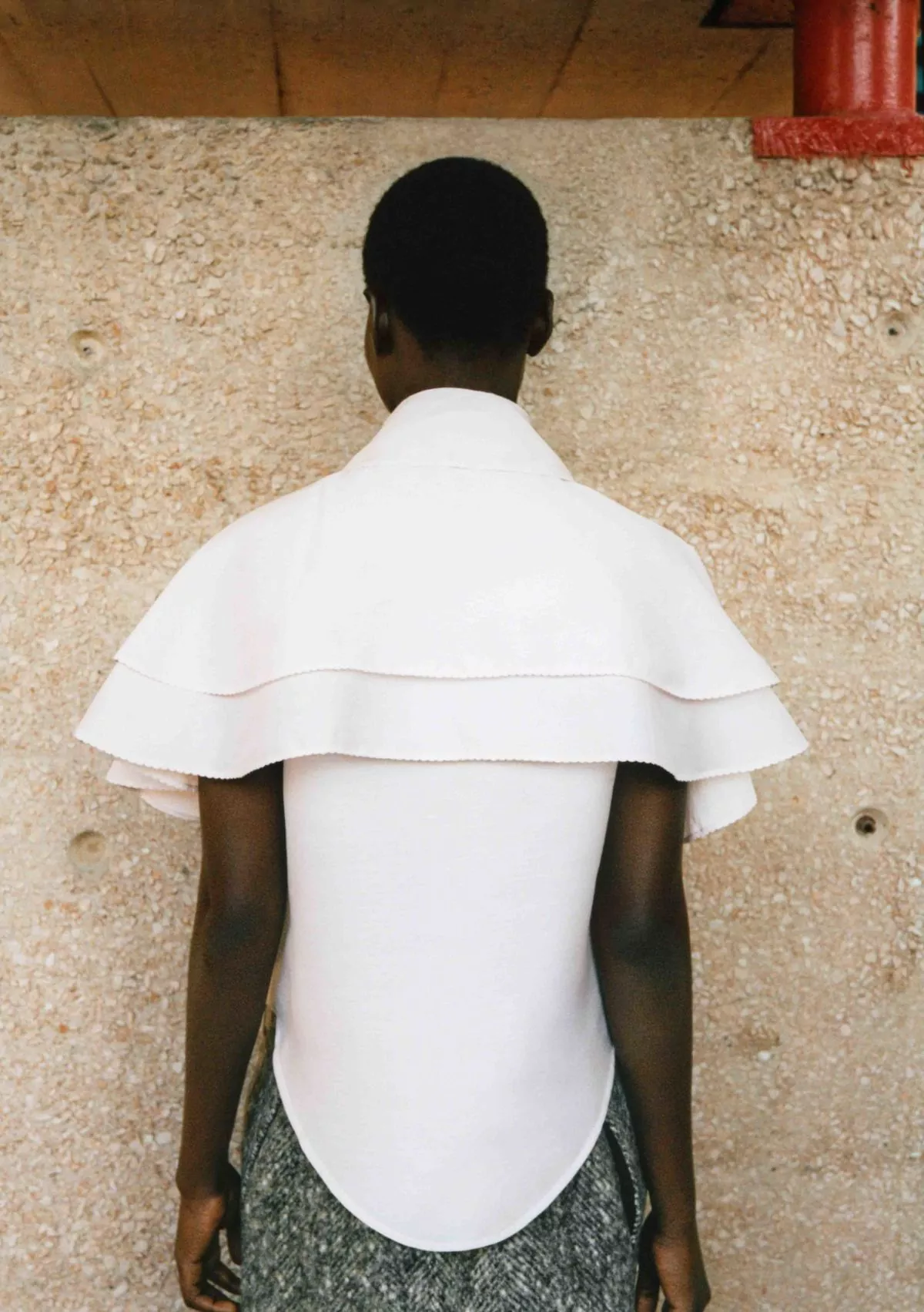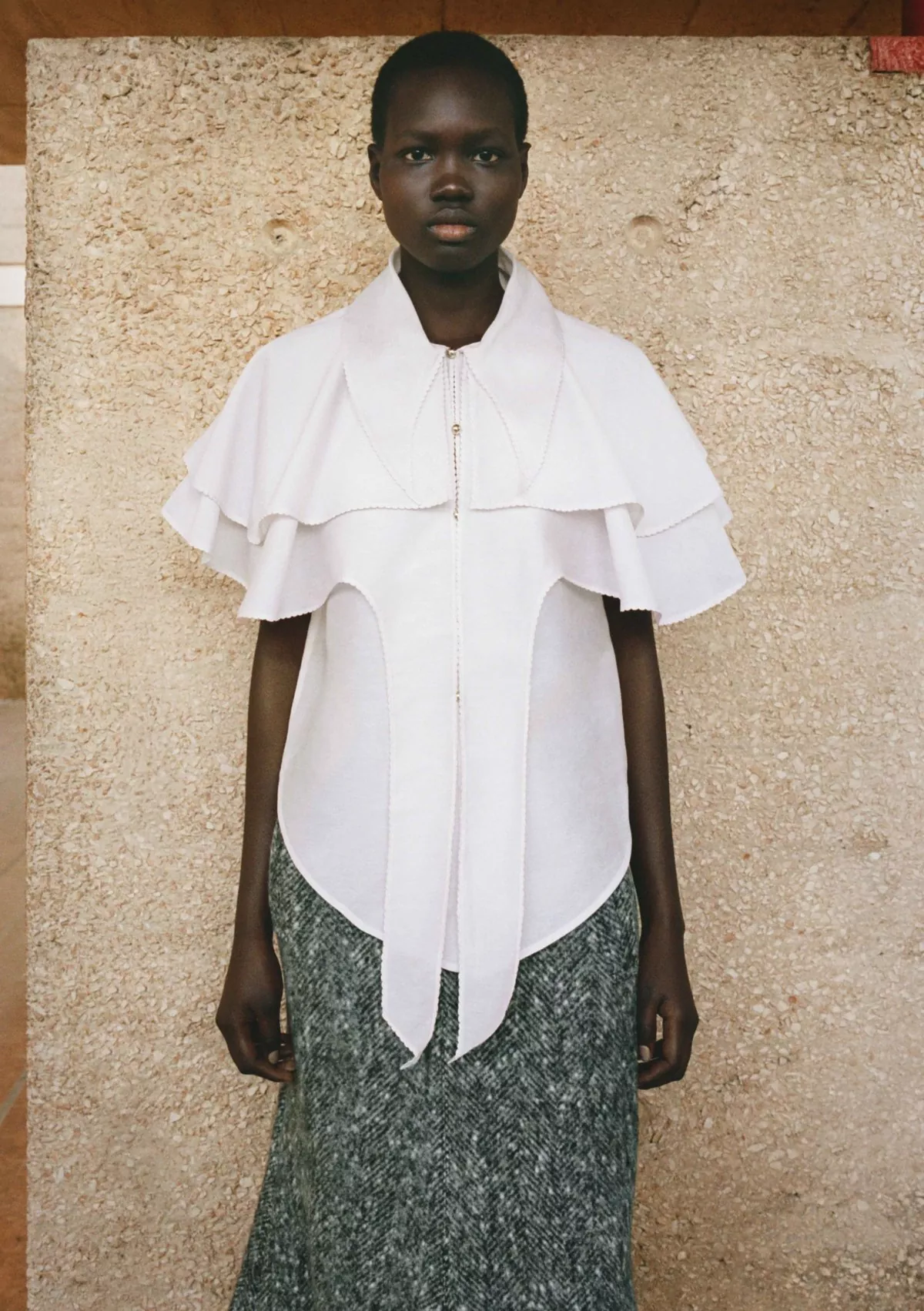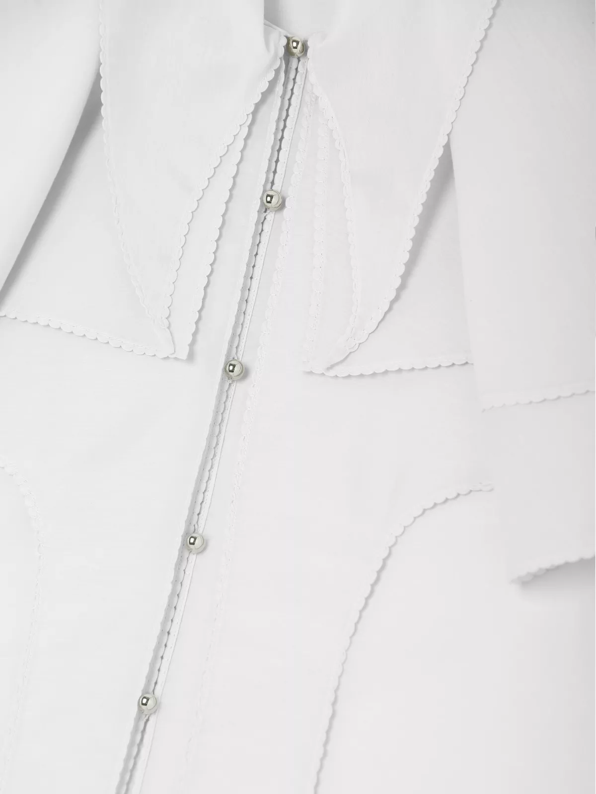 Layered top crafted from a lightweight cotton-silk blend, offering a soft, fluid drape with a subtle sheen. The front is detailed with delicate yarn-made buttonholes, each accented by a small silver boule for an elegant, artisanal touch. Featuring a bold shirt collar and a sculptural shoulder mantle, the silhouette blends classic tailoring with a contemporary twist. The edges are finished with doll stitching, adding a refined, hand-crafted feel to the overall design.